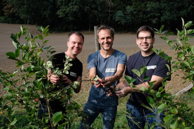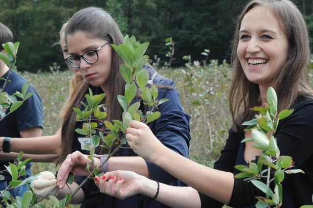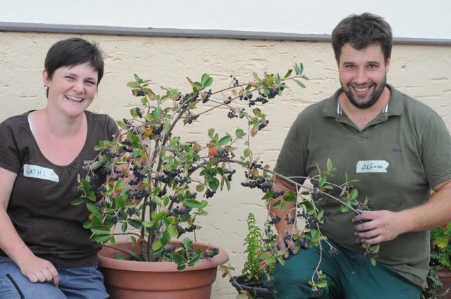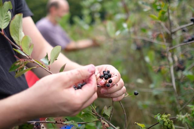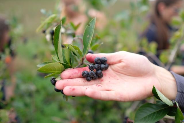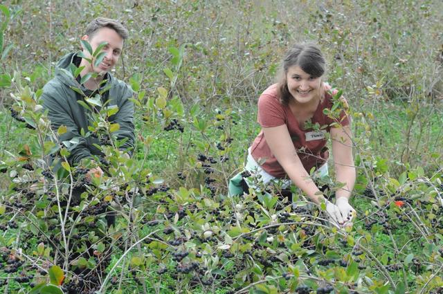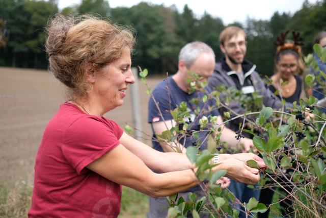 Mit diesem Wissen gewappnet ging es los zur Ernte. Nach einem kleinen Fußmarsch war es soweit: vor uns erstreckten sich die unzähligen Sträucher, an denen die Aronia-Beeren bereits auf ihre Ernte warteten.